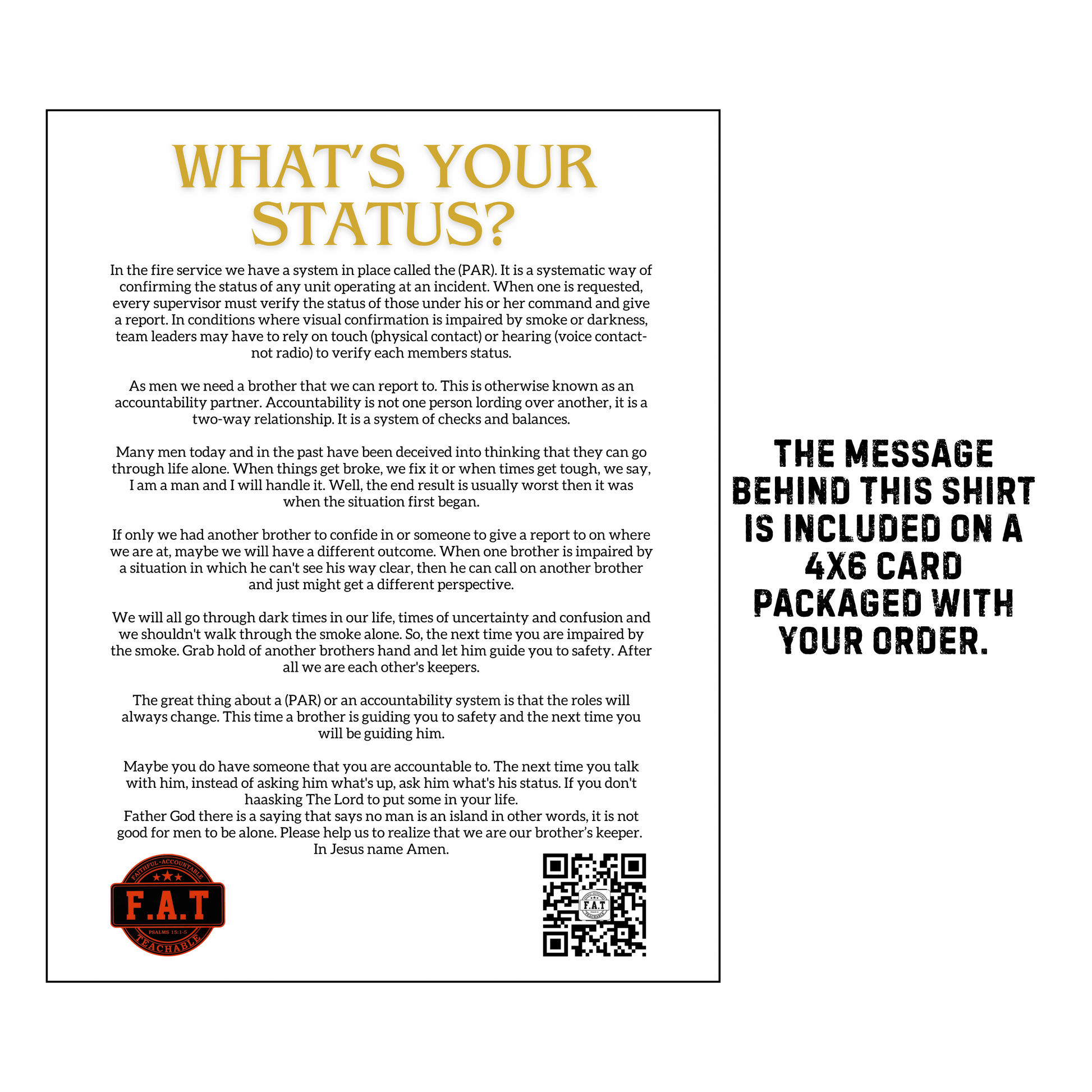 Each shirt includes a 4x6 card explaining the powerful message of brotherhood, accountability, and spiritual leadership that inspired the design. It’s more than a shirt — it’s a call to check in, step up, and look out for your crew.