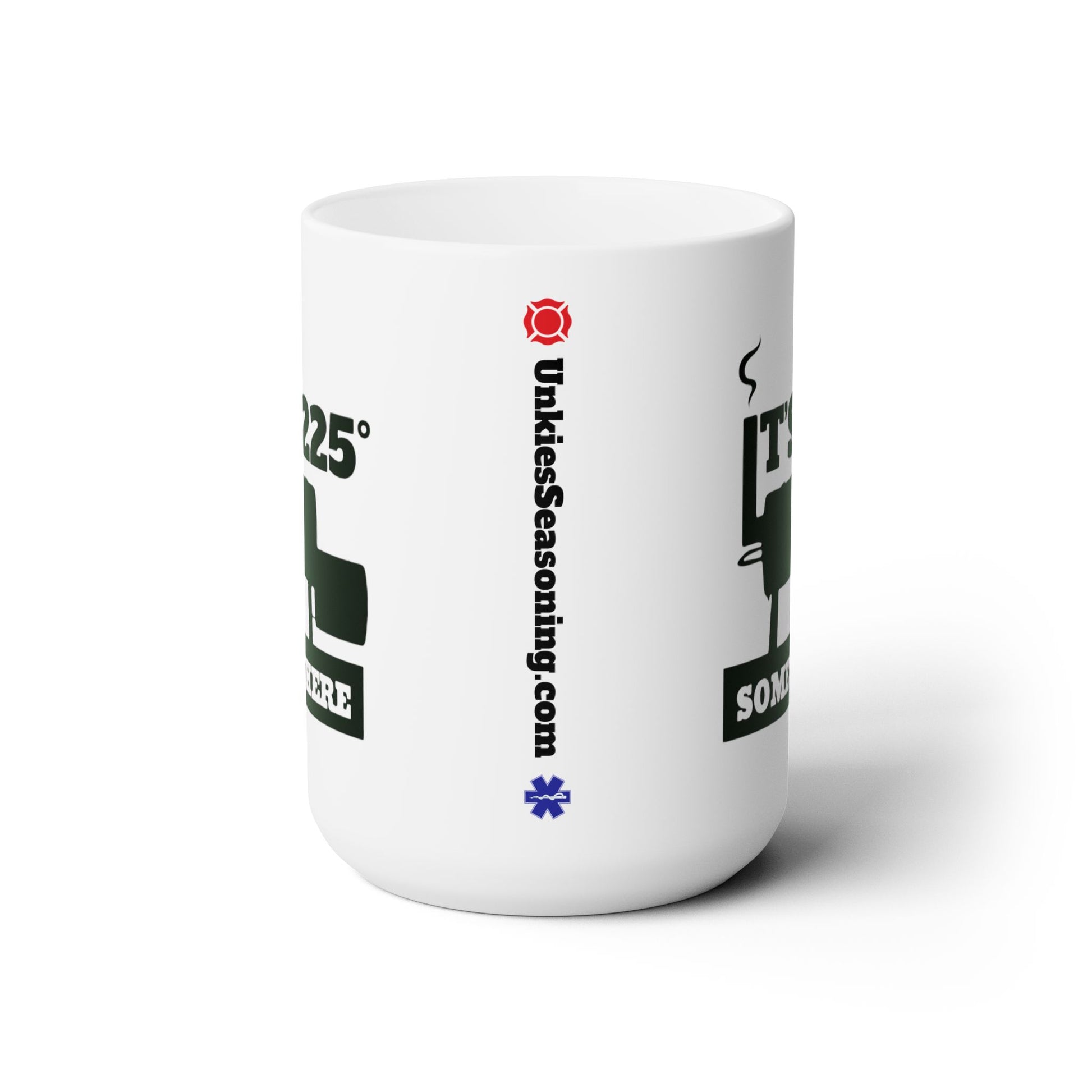 Fire up your morning with the It’s 225° Somewhere mug! Perfect for BBQ lovers, this 15 oz white ceramic mug features a bold smoker graphic and durable design. Microwave and dishwasher safe, it's ideal for sipping coffee while waiting for that perfect low-and-slow cook.